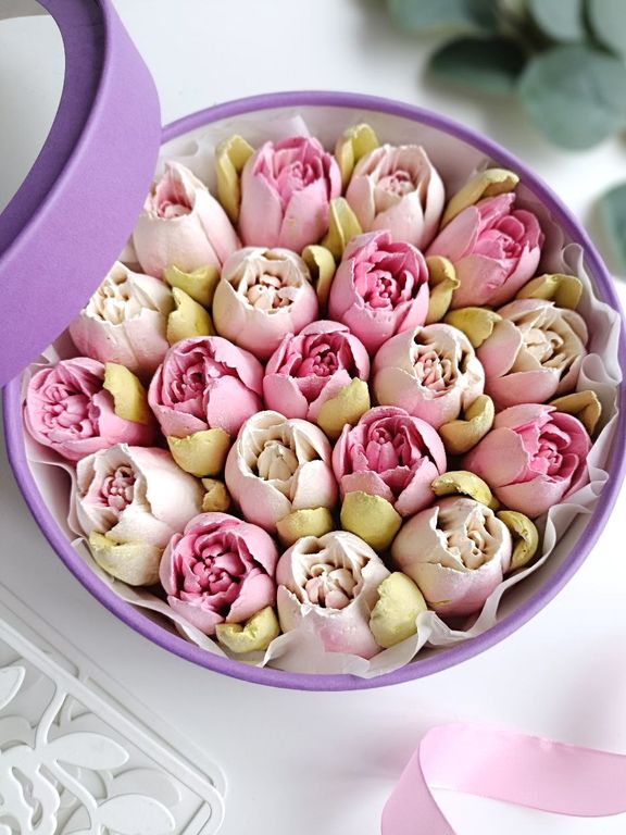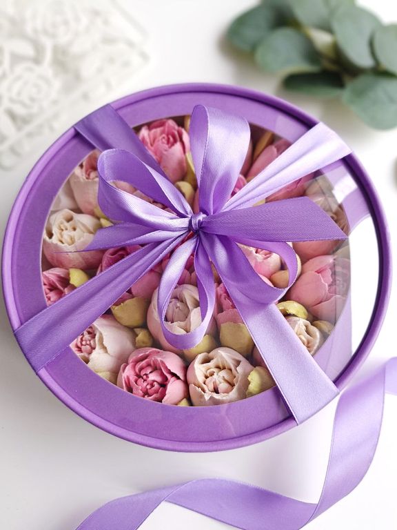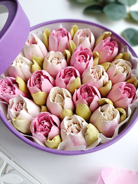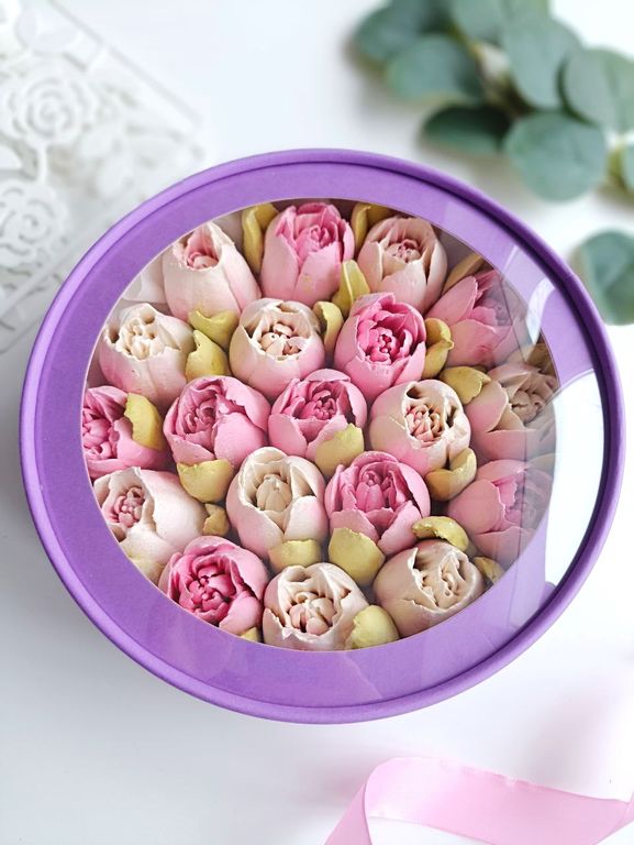 Шляпная коробка с тюльпанами из зефира (фиолетовая)